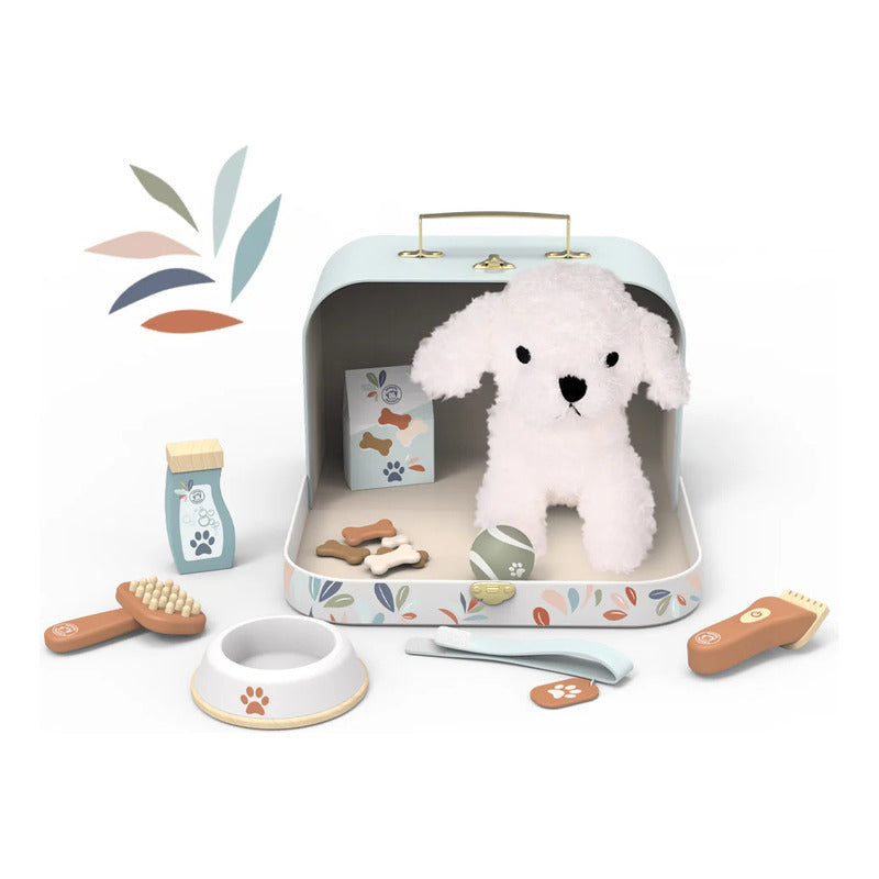 Los niños tendrán todo lo que necesitan en esta maleta bellamente diseñada para cuidar a su perro de peluche favorito (incluido). Cuenta con snacks para perros, tazón, cepillo, collar y algunos accesorios más.