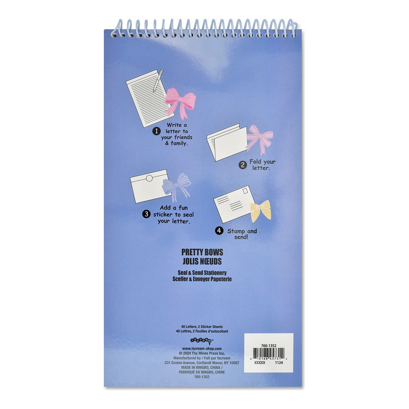 Haz que sea fácil y divertido para tu hijo mantenerse en contacto con sus amigos y familiares con este paquete de papelería "Sellar y Enviar". Este libro de espiral mide 26,7 cm X 19,7 cm e incluye 40 hojas a todo color, rayadas por una cara, listas para escribir. Después de escribir una nota, dóblala y ciérrala con una de las pegatinas incluidas. ¡Listo para enviar! ¡Es la manera perfecta de escribir una nota de agradecimiento a una amiga o contarle a la abuela sobre el campamento de verano!