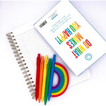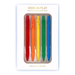 Nuestros bolígrafos WORD PLAY vienen bellamente empaquetados y tienen clips con letras, cuerpos suaves al tacto y tinta de gel negra.