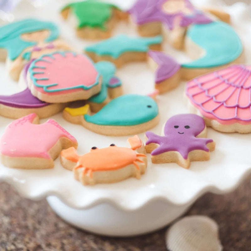 ¡Disfruta de océanos de diversión cada vez que hornees con nuestro gran juego de cortadores de galletas! El juego de 10 piezas para uso real en la cocina presenta divertidos cortadores inspirados en el mar en varios tamaños.