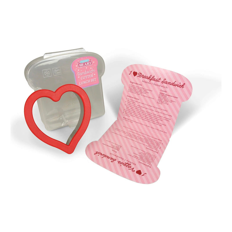 INCLUYE: 1 cortador de sándwich de corazón de acero inoxidable, 1 caja de sándwich y recetas.