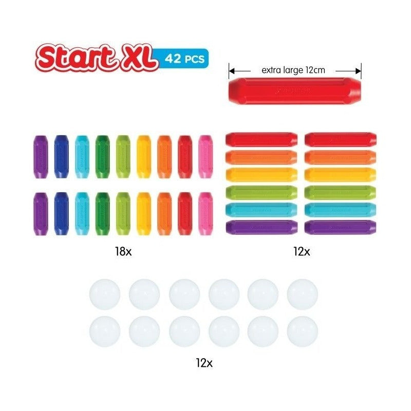 EL SET INCLUYE: 42 piezas coloridas y de gran tamaño, incluyendo barras extra fuertes y bolas de metal.