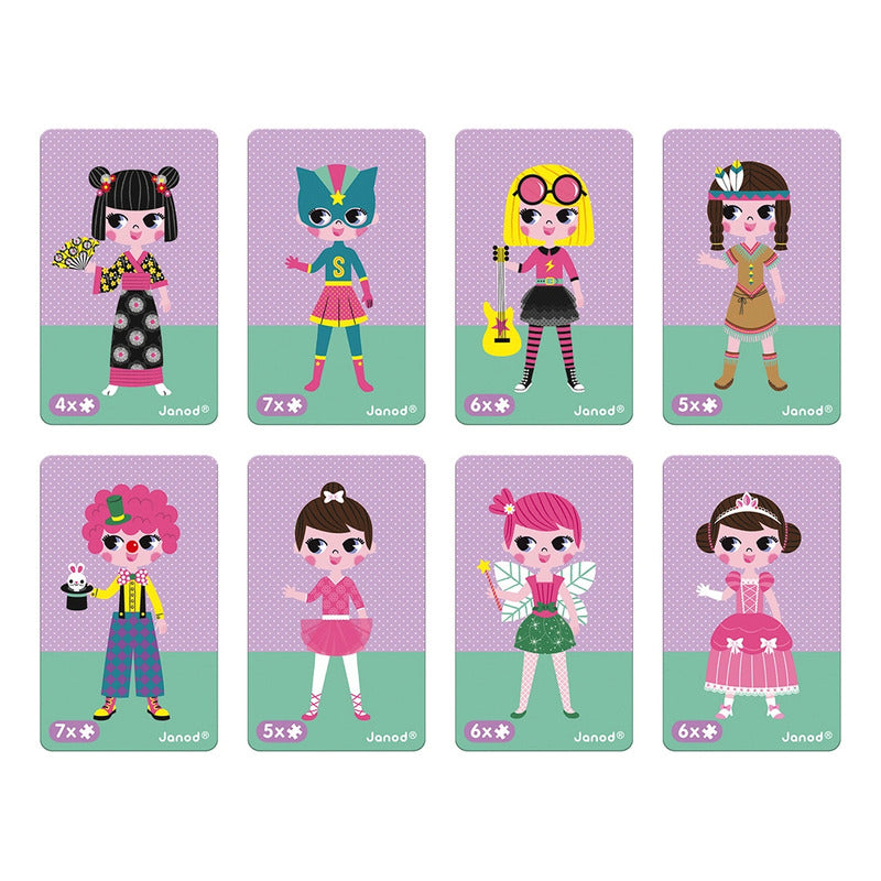 Este juego educativo magnético de cartón transportará a las niñas a partir de 3 años con la temática de los disfraces para niñas, gracias a sus 46 imanes y 8 tarjetas de ejemplos.