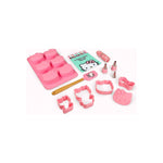 INCLUYE: 1 molde de silicona para cupcakes, 3 cortadores de galletas, 1 sello de galletas con cortador, 1 espátula de silicona, 1 bolsa de glaseado reutilizable, 1 base de acoplador de glaseado con 1 anillo y 3 puntas de glaseado, además de recetas.