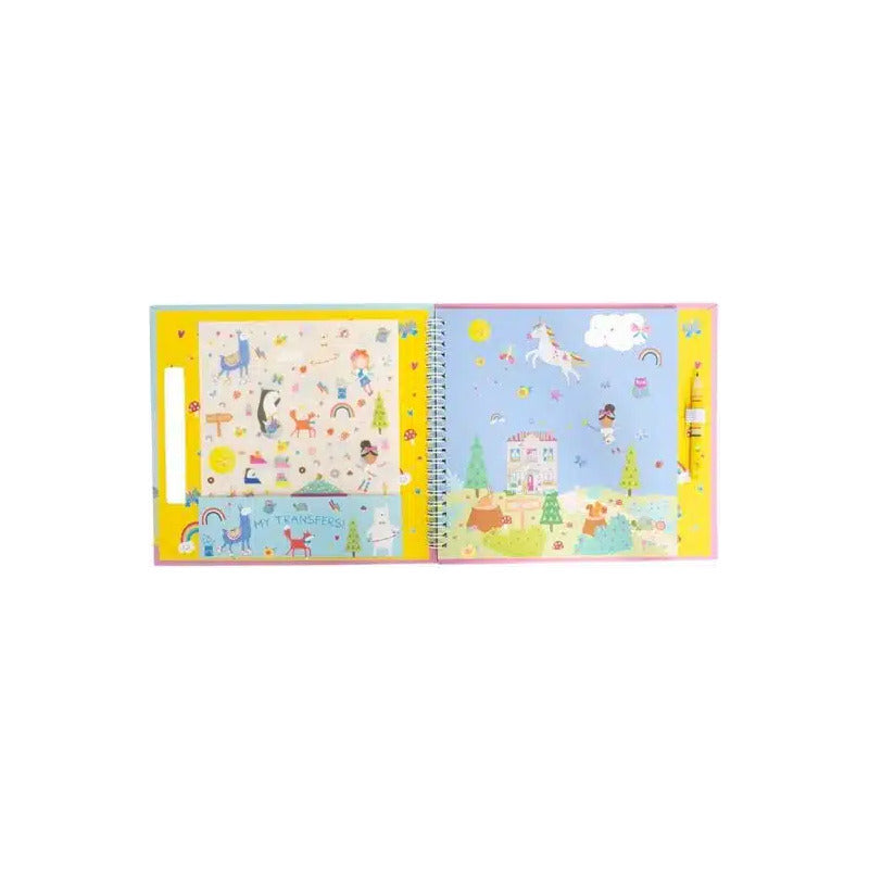 Simplemente coloque la lámina de calcomanía en una de las hojas de fondo, raye el dibujo con un lápiz y luego levante la lámina. Los gráficos impresos en papel te permiten crear tus propias historias de fantasía con hadas, unicornios, una llama azul, un zorro de la suerte y otros animales.