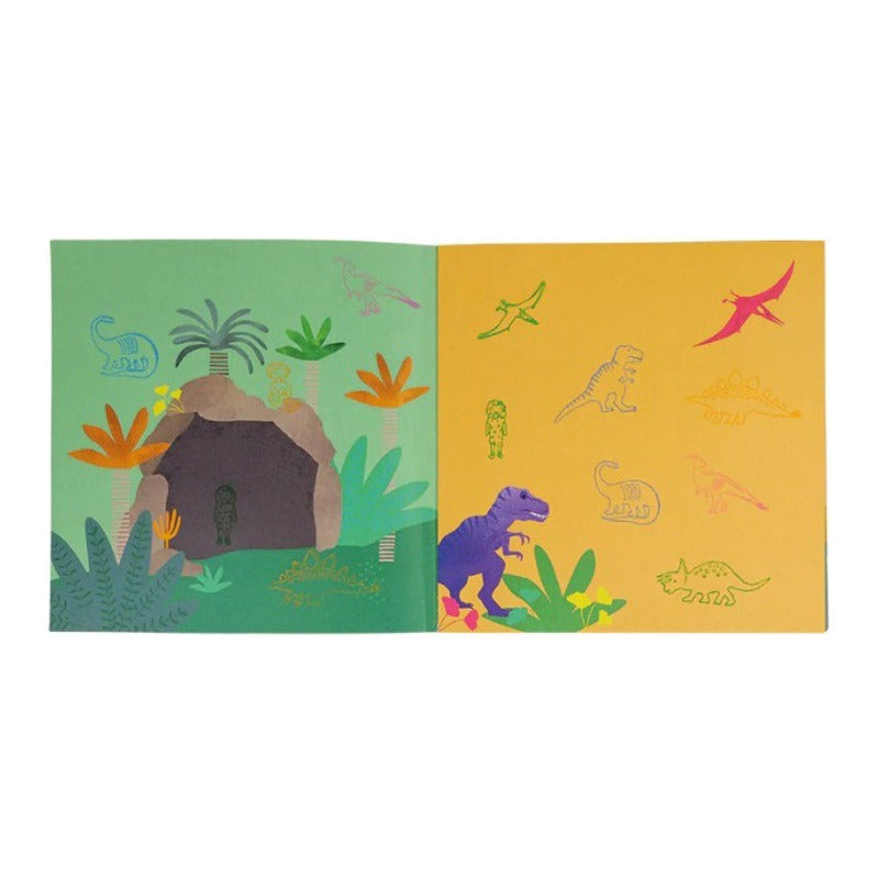- Folleto de 24 páginas a todo color: Proporciona un espacio para estampar y crear escenas e historias de dinosaurios.