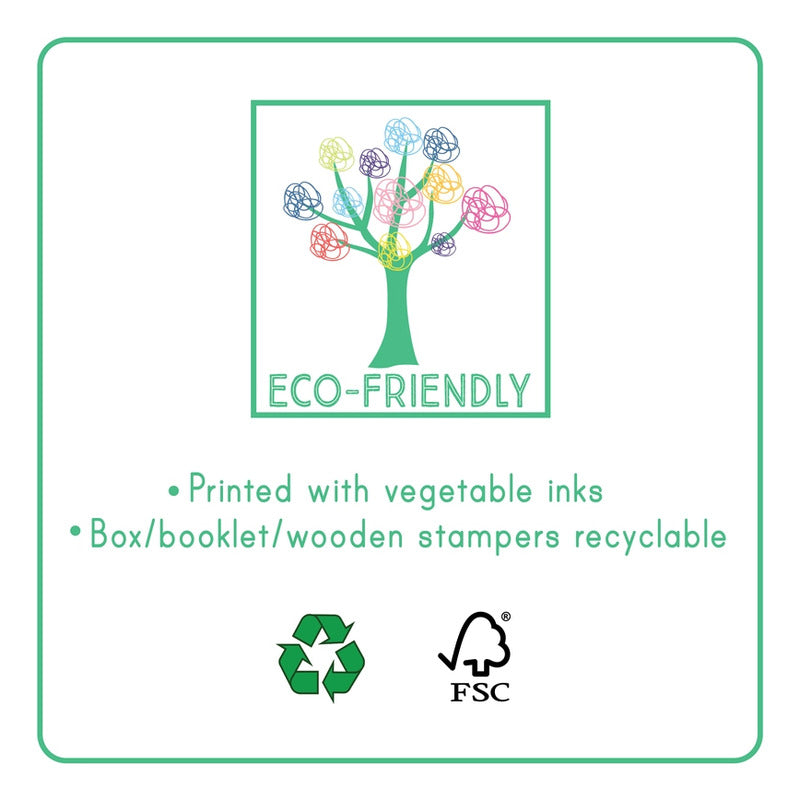 Inventa escenas y cuenta historias con los 8 divertidos sellos, las 4 almohadillas de tinta de colores y el folleto de 24 páginas a todo color, todo ello guardado de forma ordenada dentro del cajón extraíble dentro de un práctico estuche de transporte.
