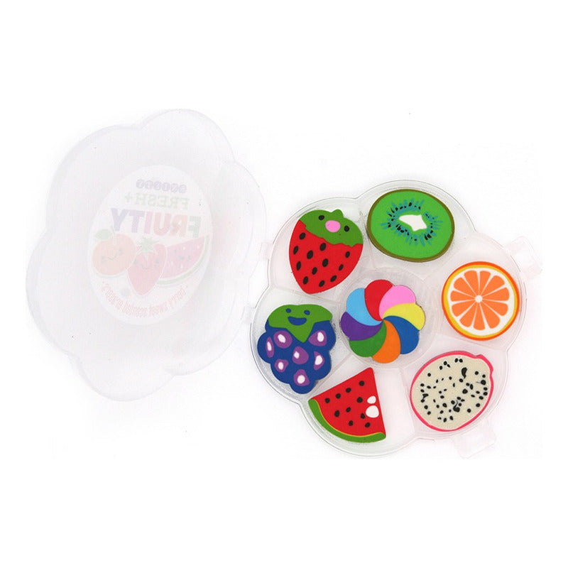 Set de 7 borradores con aroma a frutas en un estuche de plástico de 10 cm de diámetro