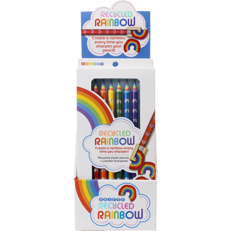 ¡Deja un arcoíris dondequiera que vayas! ¡Los lápices arcoíris reciclados crean un pequeño arcoíris de papel al afilarlos! Hechos con papel reciclado y sin árboles.