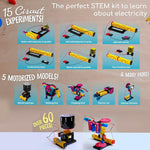 Realice experimentos para aprender sobre muchos componentes eléctricos y principios de ciencias físicas de primera mano. De circuito en circuito, puedes comprobar por ti mismo los diferentes efectos que tiene la corriente eléctrica en el motor y la luz LED.