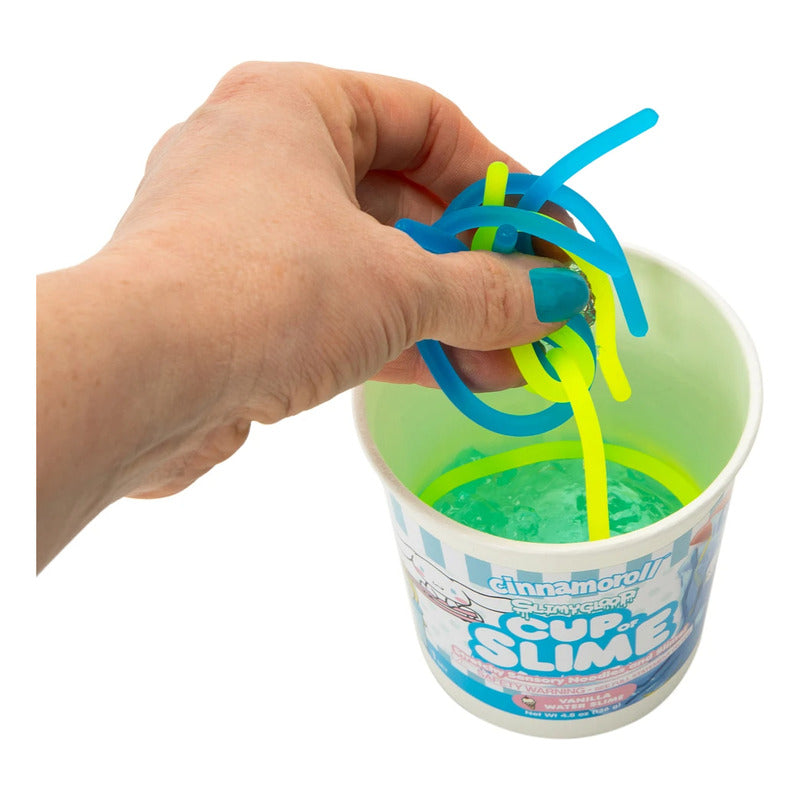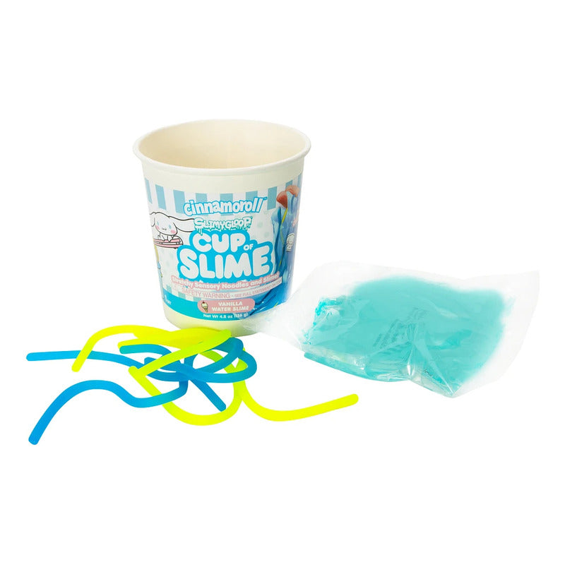 EL SET INCLUYE: 1 contenedor, 6 fideos elásticos, 1 slime con aroma a vainilla (4.8 oz), 1 dije de Cinnamoroll
